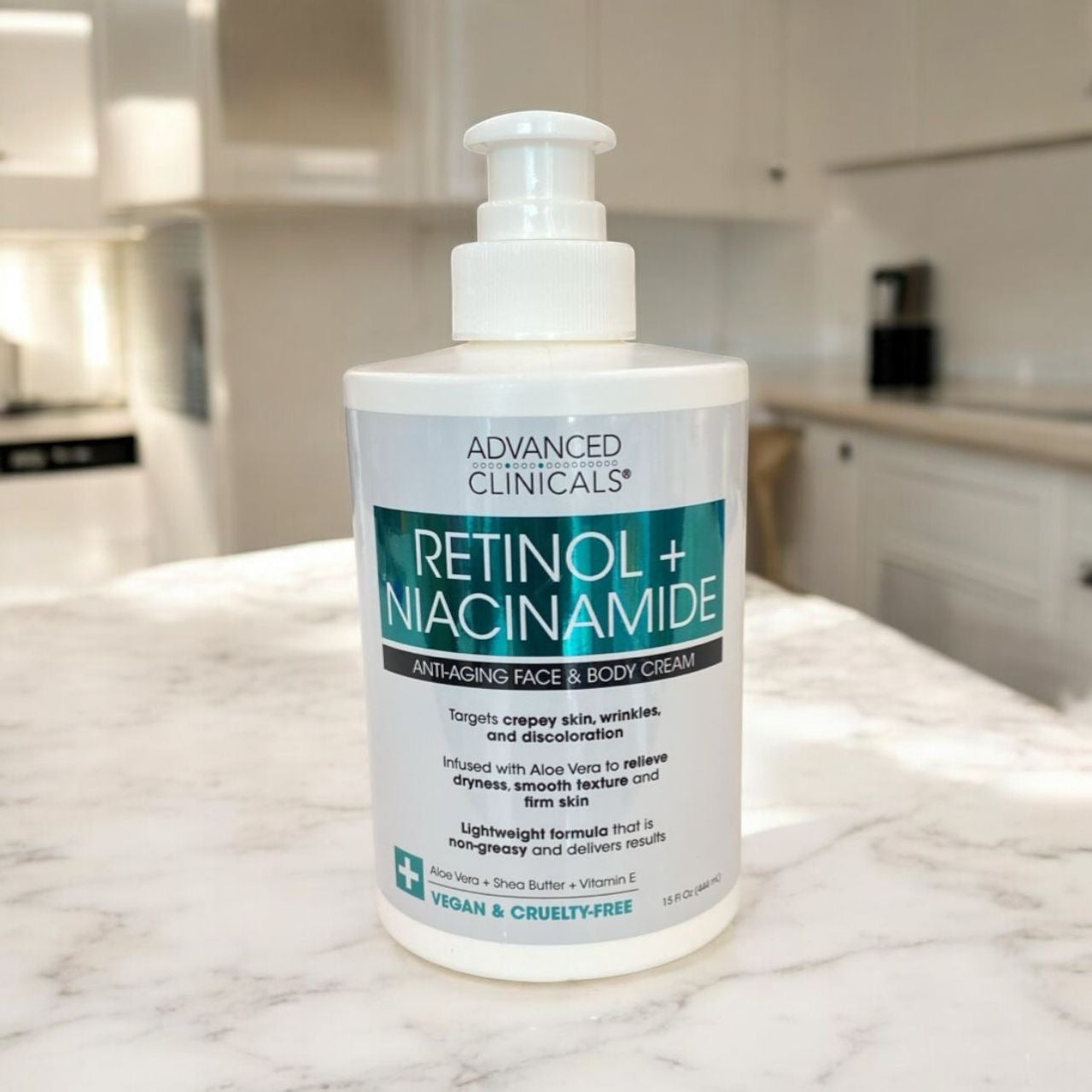 Advanced Clinicals Retinol + Niacinamide Body Cream: Targets crepey skin, wrinkles,and discoloration. Infused with aloe Vera to relieve dryness,smooth texture and firm skin. Lightweight formula that is non- greasy and delivers results.