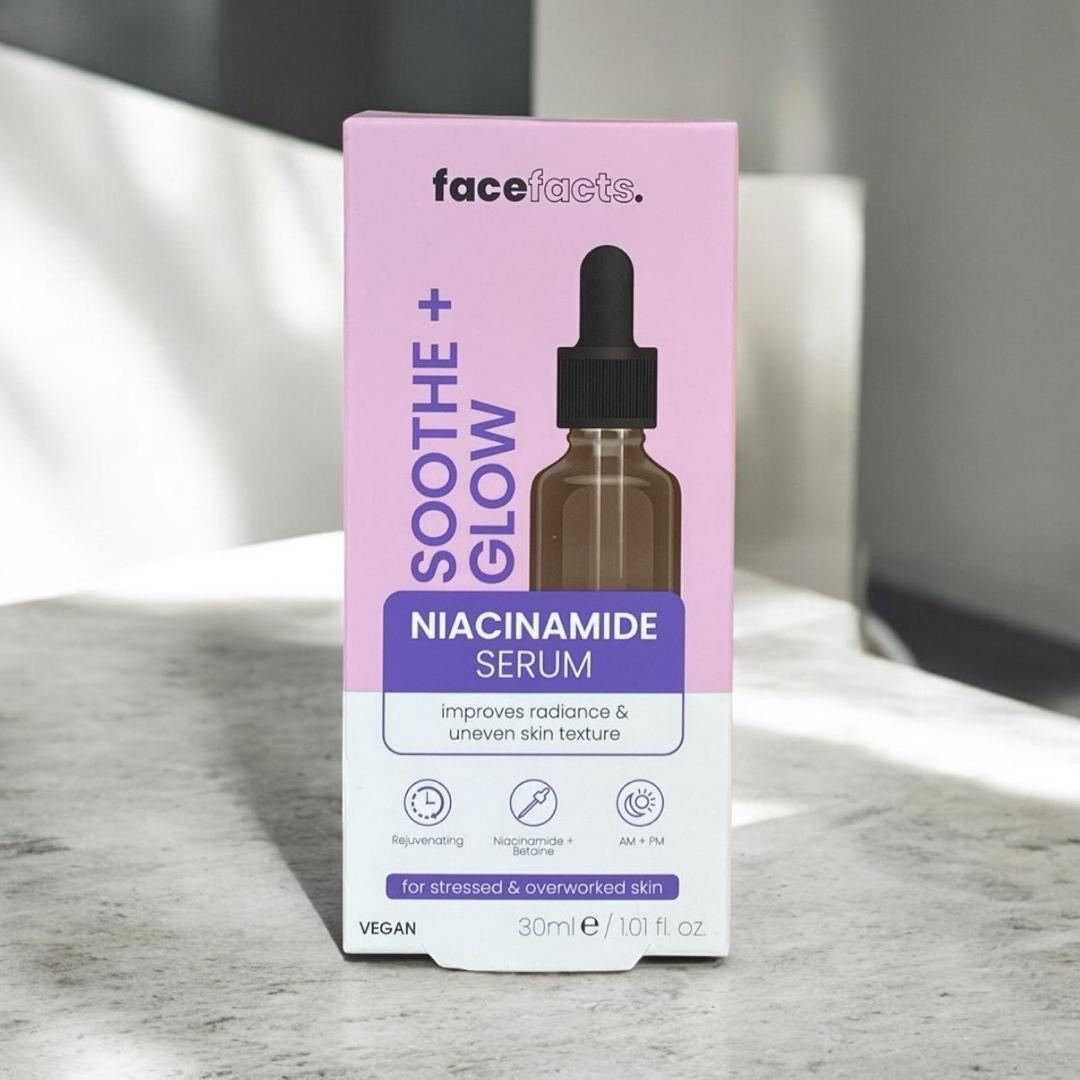 Face Facts Soothe + Glow Niacinamide Serum is a vegan friendly serum helps restore dull skin and help prevent environmental damage It contains niacinamide, a form of vitamin B3, and betaine, a skin hydrator.