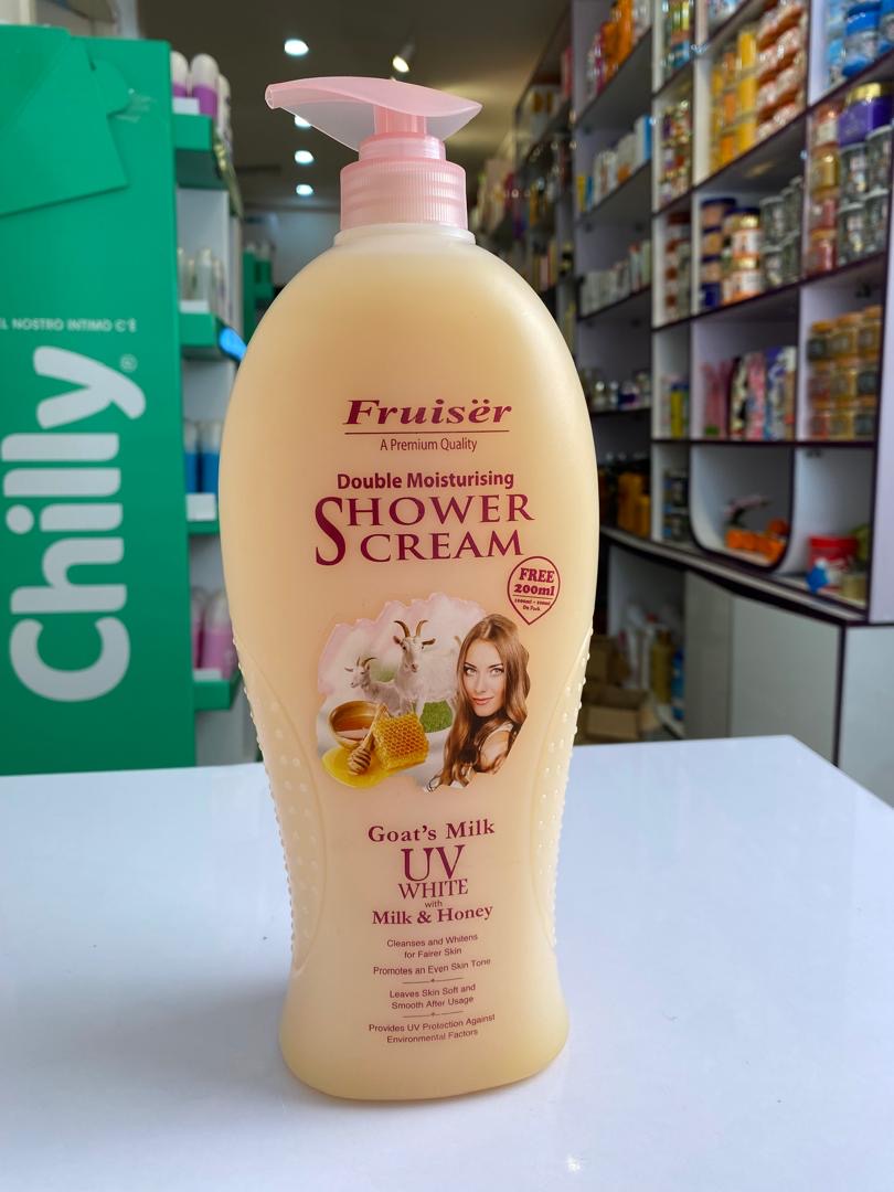 Description:Cleanses,whitens and promotes an even skin any time you shower, leaving skin soft,smooth and protected daily.Fruiser shower cream goat’s milk UV whitening with milk and honey helps support a brighter complexion and skin tone as it provides UV protection.
