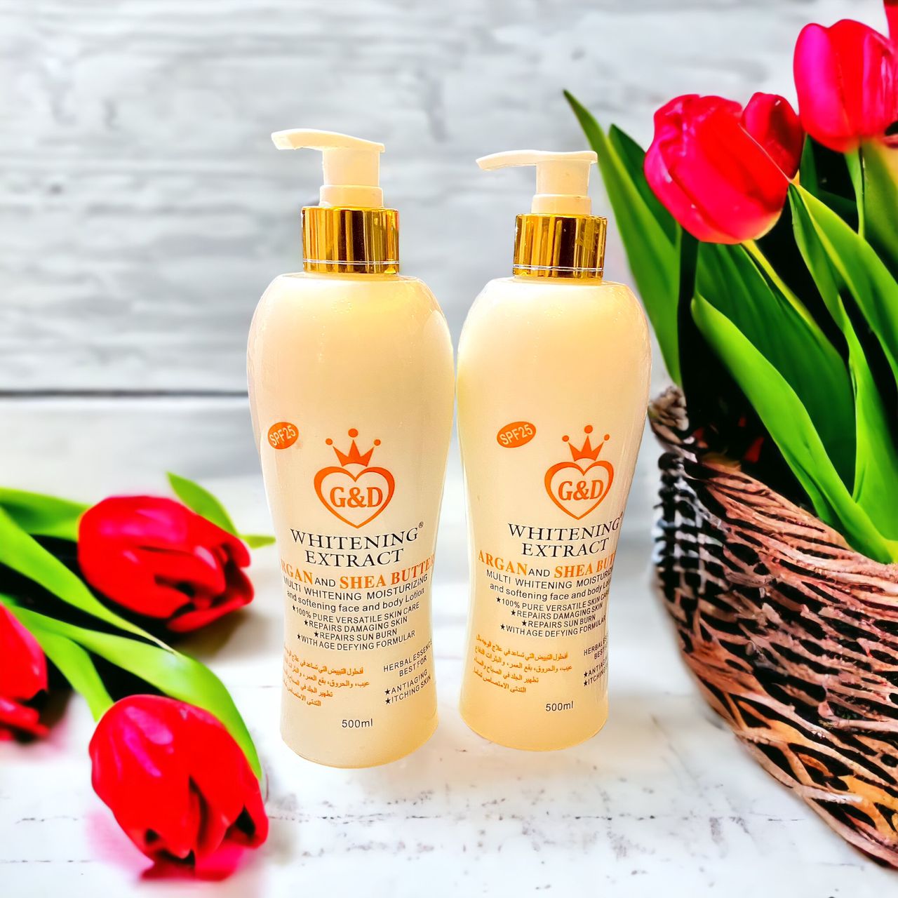 Body repair lotion with shea butter and argan extracts. Multi whitening moisturizing and softening face and body lotion.