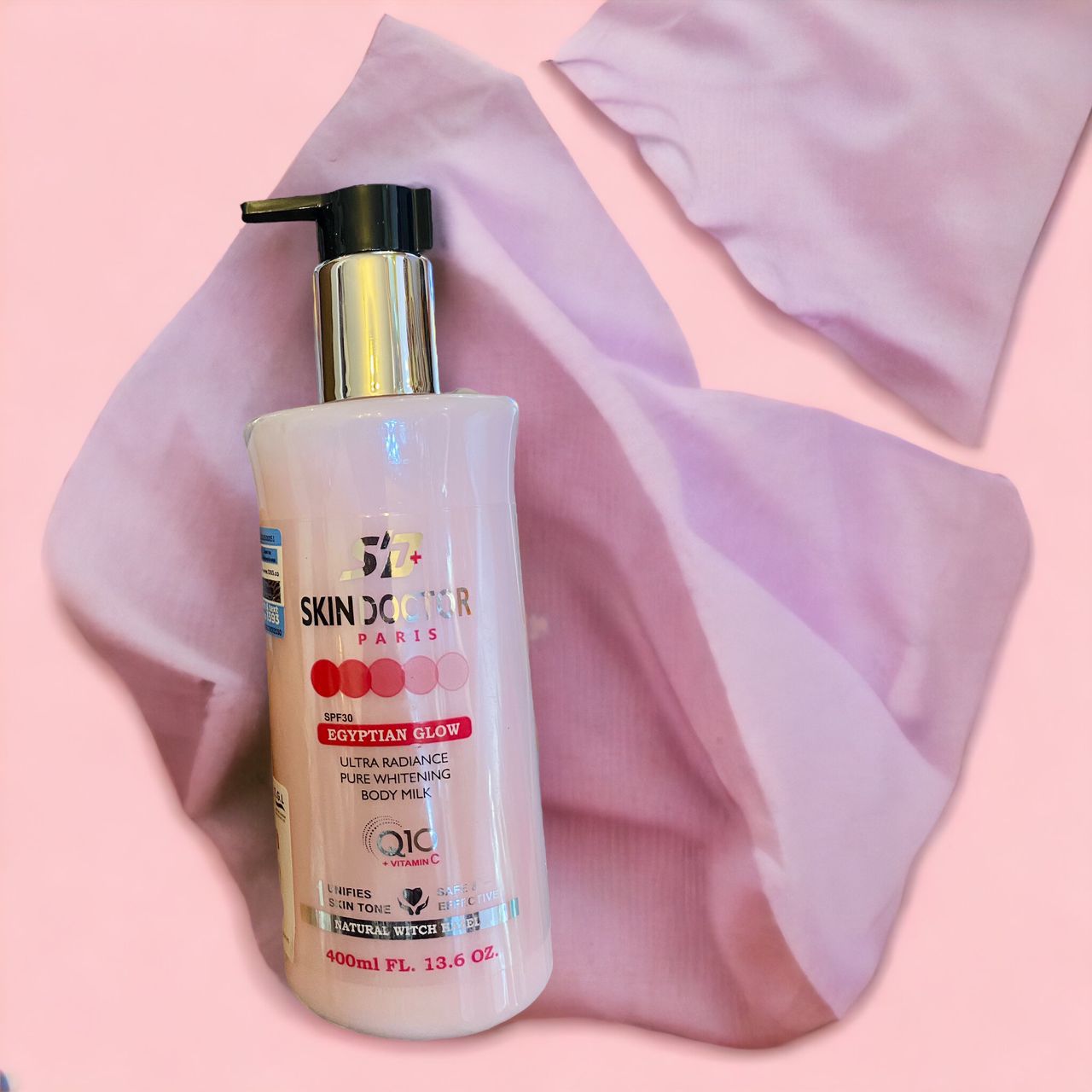 SKIN DOCTOR EGYPTIAN GLOW BODY LOTION is specially made with a combination of natural witch hazel, Egyptian milk, licorice and arbutin to give a fabulous and luxurious lightening effect on black and half caste skins. This formula exfoliates, treats and helps eliminate freckles, age spot, acne, scars, liver spot and sunburn to give the skin a clear brighter, smooth and silky look. The UVA/UVB filters helps protect the skin against damage and maintain an excellent effect.