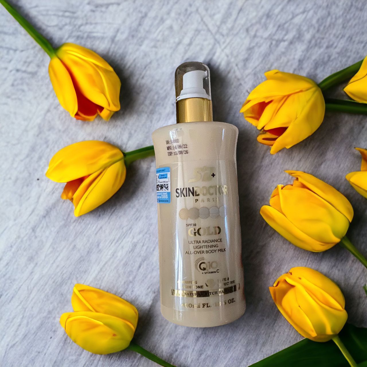 Skin Doctor Gold Body Lotion is a luxurious and unique blend of best lightening agents available to gradually minimize the production of melanin, responsible for the effect of dark skin. Its daily use gradually fades hyperpigmentation problems such as freckles, age spot, acne, scars, liver spot or pigmentation marks. It makes your skin appear more radiant and youthful, reveals day after day in the perfection, a complexion of an infinitely sublime beauty.
