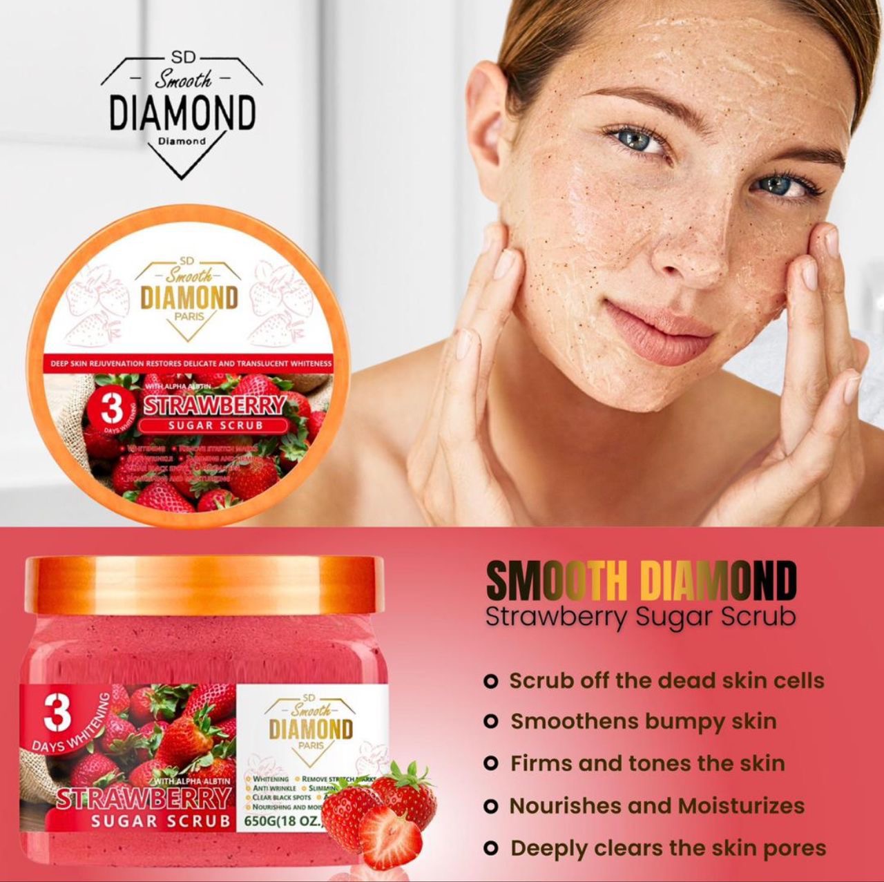 Smooth Diamond Strawberry Sugar Scrub:is a natural exfoliant that effectively polishes dead skin while helping to promote a blood circulation on the skin’s surface natural Shea butter deeply hydrate, nourishes and softens dry skin white helping to enhance elasticity.