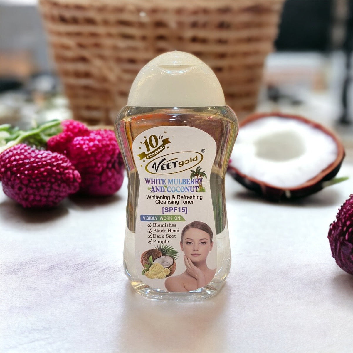 Veetgold Coconut Water and Mulberry Refreshing Cleansing Toner leaves your skin clearer, fresher, fairer and younger looking.